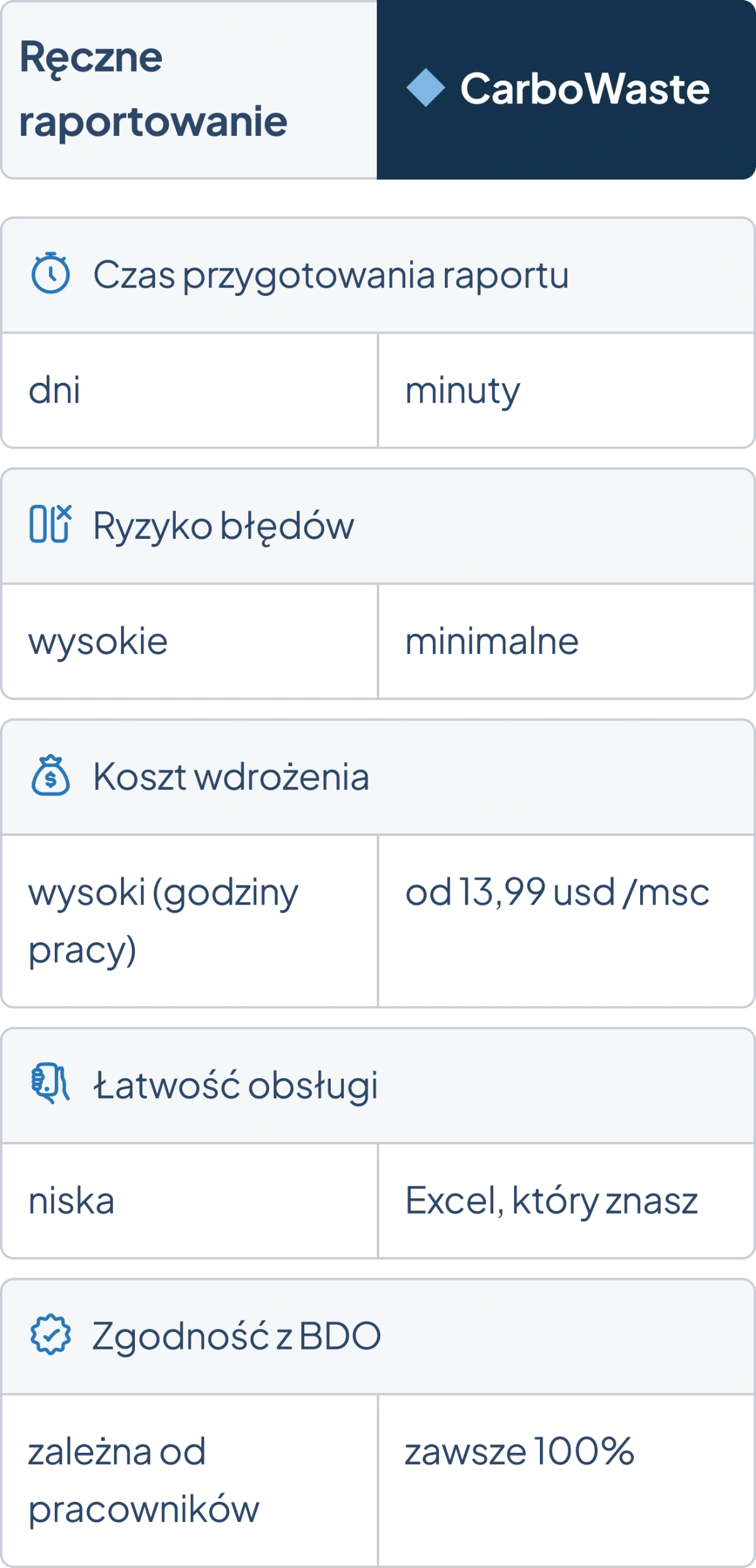 Nie ryzykuj kar i opóźnień. Dzięki CARBOwaste BDO Twoje raporty są zawsze zgodne z wymaganiami BDO, a proces zajmuje minuty zamiast dni. Dołącz do firm, które już korzystają z naszego rozwiązania.