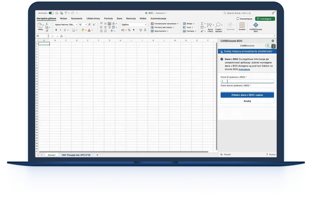 CARBOwaste BDO działa jako dodatek do Excela – nie wymaga instalowania żadnych zewnętrznych programów ani nauki nowych systemów. Korzystasz z narzędzia, które znasz i lubisz.
