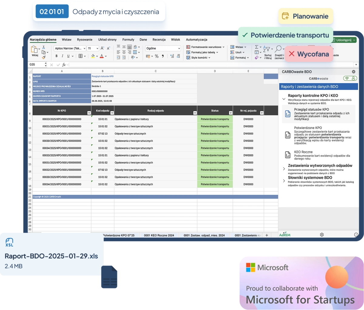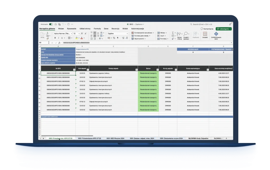 CARBOwaste BDO rozwiązuje te problemy, pobierając dane bezpośrednio z BDO i przetwarzając je w dobrze znanym środowisku Excel. Dzięki automatyzacji i integracji z bazą BDO, zyskujesz pełną kontrolę nad danymi przy minimalnym nakładzie pracy.