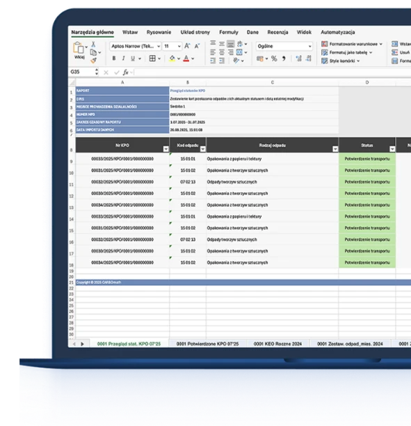 Jednym kliknięciem Excel automatycznie importuje kompletne informacje o odpadach w czytelnej, uporządkowanej formie. Co wcześniej zajmowało godziny – teraz trwa minuty.