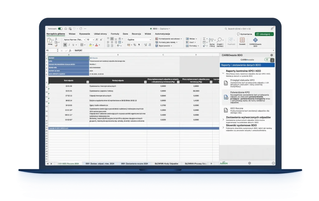 Sprawdź, czy jesteś gotowy do złożenia rocznego sprawozdania odpadowego w BDO! Wtyczka do Excela – CARBOwaste BDO zweryfikuje Twoją ewidencję i wskaże ewentualne błędy.